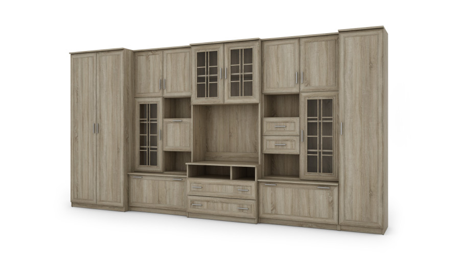 A bútor egy nagy ruhásszekrényből rúddal, fehérneműs szekrényből öt polccal, üvegvitrinekből, fiókokból, bárból, nyitott fülkékből és egy nagy fülkéből áll a televízió számára. Ez kiváló megoldás azoknak, akiknek sok tárolóhelyre van szükségük különféle tárgyak számára, a ruháktól a könyvekig, dekorációkig vagy elektronikus berendezésekig. A LENA szekrénysor lehetővé teszi a rend fenntartását a helyiségben, miközben könnyű hozzáférést biztosít a szükséges dolgokhoz.