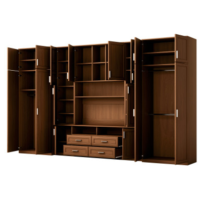 A készlet olyan személyek számára készült, akik maximálisan ki akarják használni a rendelkezésre álló helyet. A bemutatott nappalibútorban mindent megtalál, amire szüksége van – ruhasszekrényt rúddal a ruhaakasztókhoz, fehérneműtartót 5 polccal, üvegvitrineket, fiókokat, bárt, nyitott és zárt fülkéket ajtók mögött, sőt még egy nagy fülkét is a televízióhoz, alul hellyel a TV dekóderhez stb.