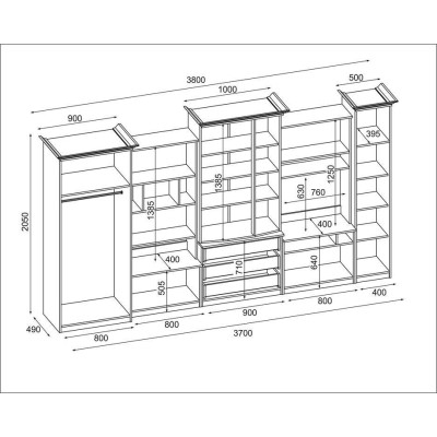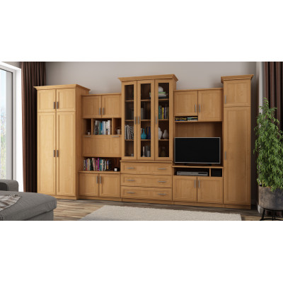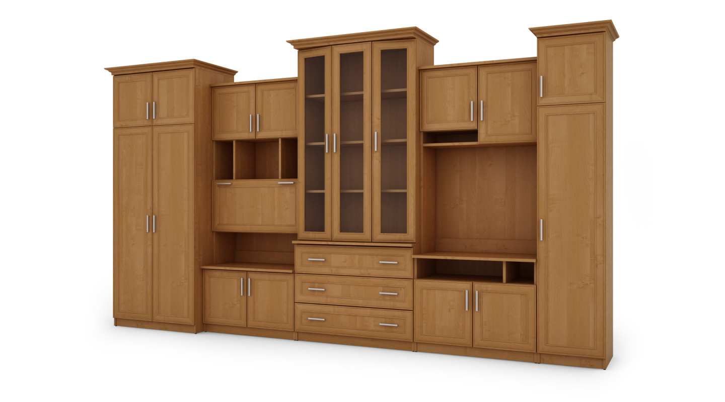 A készlet azoknak az embereknek szól, akik maximálisan ki akarják használni a rendelkezésre álló teret. A bemutatott bútor falban mindent megtalál, amire szüksége van – ruhasszekrényt rúddal fogasokhoz, fehérnemű szekrényt 5 polccal, üveg vitrineket, fiókokat, bárt, nyitott és zárt fülkéket, sőt még egy nagy fülkét a televízióhoz TV dekóder helyével stb.