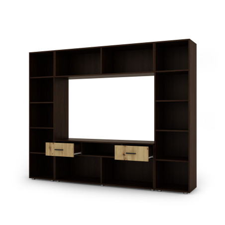 A multimédiás szekrénnyel ellátott faliszekrény elegáns és funkcionális bútor, amely tökéletesen illeszkedik a szobájába. Átfogó rendszer, amely polcokat, szekrényeket és szórakoztató elektronikai berendezéseknek szánt teret egyesít.