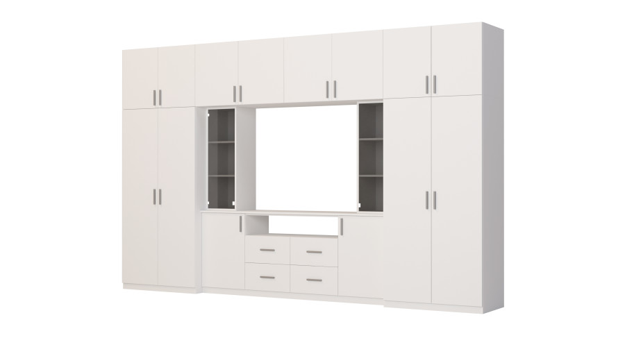 - zárható felépítmények polcokkal a készlet teljes szélességében. Ezeknek köszönhetően a nappali bútor teljes magassága 240 cm.