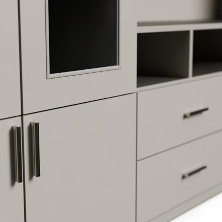 Ez egy olyan bútor fal, amely igazán sokat képes befogadni – az elegáns, zárt homlokzatok mögött elrejtheti mindazokat a tárgyakat, amelyek nem láthatóak. Az üvegezett vitrinszekrények lehetővé teszik kedvenc dekorációi hatásos kiállítását, a TV tér pedig úgy lett megtervezve, hogy kényelmesen elhelyezze a televíziót és multimédiás berendezéseket.