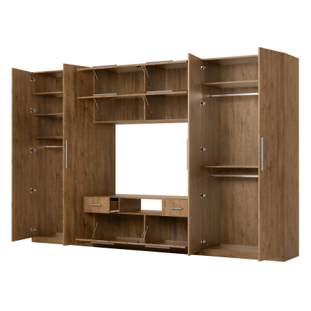 Miért válassza a SCANDI-t? Ha értékeli a tágas szekrényeket különböző magasságú akasztórudakkal, amelyek mind a hosszú kabátokat, mind a rövid blúzokat befogadják – válassza ezt a szekrénysor modellt. A SCANDI a szekrényeken kívül nagy számú polccal rendelkezik, amelyek tökéletesek ruházat, cipők, táskák vagy ágynemű tárolására. Ráadásul a TV szekrény befogad egy nagy televíziót és audio-video berendezéseket. És ha ez még nem lenne elég, a SCANDI további tárolóhellyel is rendelkezik – egy kiegészítő elemmel, amelyet a falba lyuk fúrása nélkül szerelhet fel.