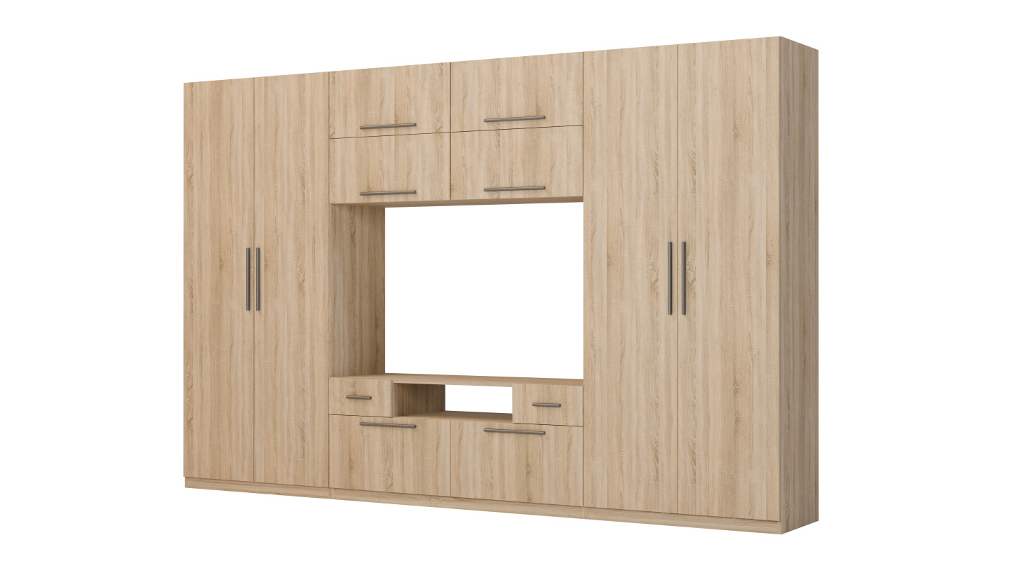 Miért válassza a SCANDI-t? Ha értékeli a tágas szekrényeket különböző magasságú akasztórudakkal, amelyek mind a hosszú kabátokat, mind a rövid blúzokat befogadják – válassza ezt a szekrénysor modellt. A SCANDI a szekrényeken kívül nagy számú polccal rendelkezik, amelyek tökéletesek ruházat, cipők, táskák vagy ágynemű tárolására. Ráadásul a TV szekrény befogad egy nagy televíziót és audio-video berendezéseket. És ha ez még nem lenne elég, a SCANDI további tárolóhellyel is rendelkezik – egy kiegészítő elemmel, amelyet a falba lyuk fúrása nélkül szerelhet fel.