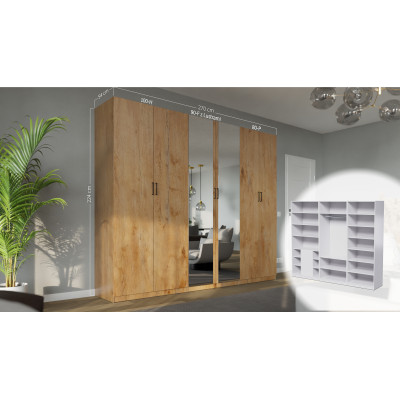 A szekrény belsejében tágas rúd található, amely lehetővé teszi a ruhák kényelmes tárolását vállfán, mint például öltönyök, kabátok, bundák vagy ruhák. Ezt tágas polcok egészítik ki, amelyek ideálisak pulóverek, farmerek, táskák vagy háztartási textíliák tárolására. Ez a kombináció rugalmasságot biztosít a használatban és kényelmet a mindennapi működésben.