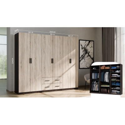 A szekrény belseje nagy gondossággal lett megtervezve az ergonómia szempontjából. A két ruhazó egymás fölött elhelyezve lehetővé teszi a függőleges tér maximális kihasználását, nagyobb számú ing, ruha, zakó vagy kabát tárolását téve lehetővé. A bútor felső részében elhelyezett polcok további helyet biztosítanak összehajtott ruháknak, kiegészítőknek vagy cipősdobozoknak és szezonális kiegészítőknek.