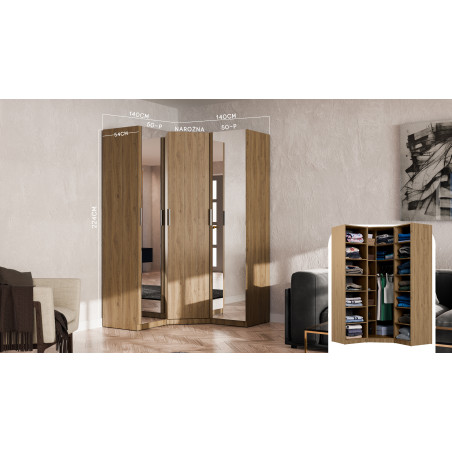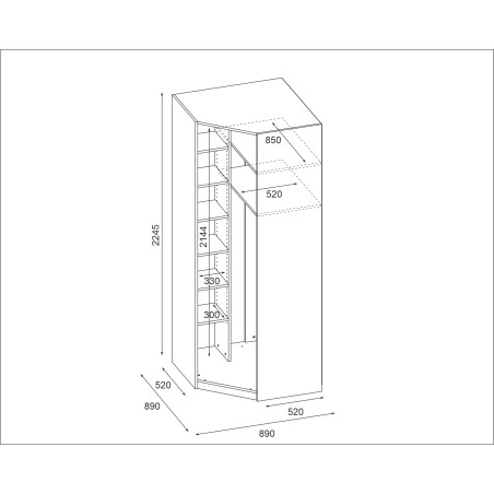 A sarok szekrény 100x100x225 cm a System MAX Premium sorozatból a tökéletes kiegészítés moduláris beépített rendszerekhez, amelyet a szoba terének maximális kihasználásának gondolatával hoztak létre. A speciálisan tervezett sarok konstrukciónak köszönhetően a bútor lehetővé teszi azon hely hatékony kihasználását, amely hagyományos elrendezésekben gyakran kihasználatlan marad. Ez kiváló javaslat a öltözőt, hálószobát vagy funkcionális gazdasági helyiséget berendező emberek számára.