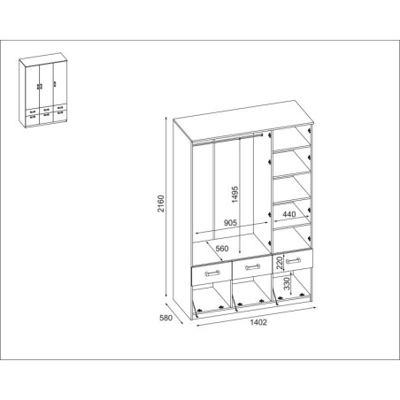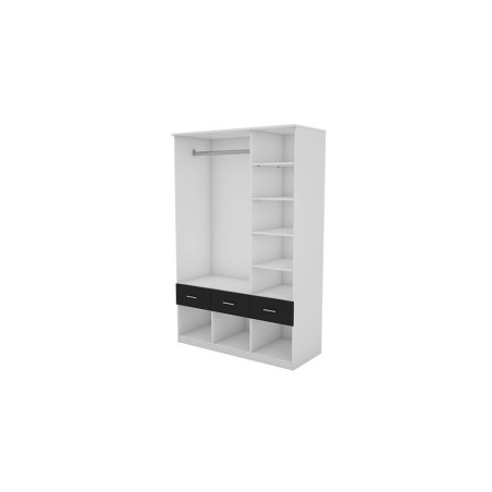 A szekrény belseje úgy van tervezve, hogy sok tárolóhelyet biztosítson számunkra. Itt találunk egy rudat, amely lehetővé teszi a ruhák felakasztását, valamint megfelelő magasságú és mélységű polcok sorát. Ezen kívül három fiók ideális kisebb tárgyak elrejtésére.