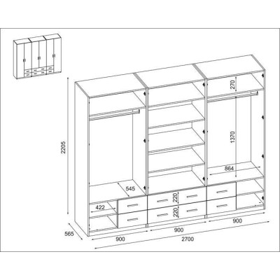 Szekrény 270/220 - ruharudak, belső polcok, 6 tágas fiók