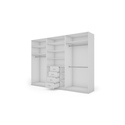 A funkcionalitást tükrözik a ruhapolcok, rudak és tágas fiókok. A készlet 3 külön szegmensből áll, amelyek együtt tágas gardróbot és nem csak azt hoznak létre.