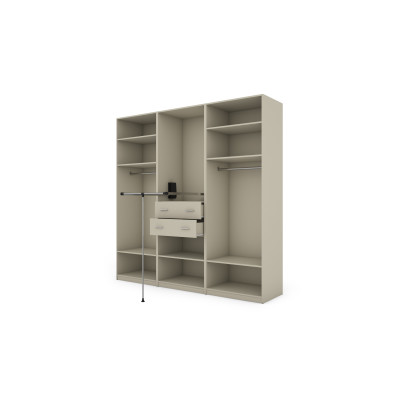 A 6 ajtós modell kiváló térszervezést biztosít a polcok és fiókok átgondolt elrendezésének köszönhetően. A beépített rudak és pantográf kényelmes tárolást tesznek lehetővé a függő ruhák számára – még a szekrény legmagasabb részeiben is. A tágas fiókok helyet adnak kiegészítőknek, fehérneműknek és egyéb apró gardróbelemeknek.