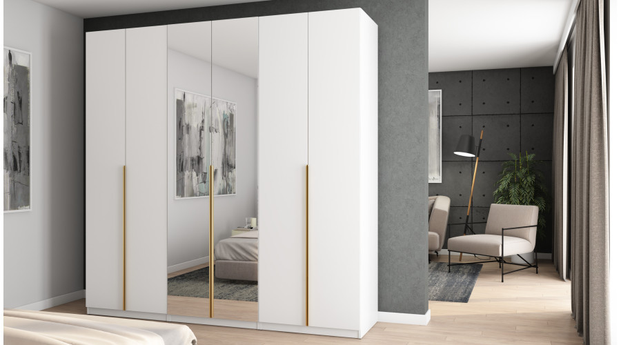 6 ajtós szekrény tükörrel 240 x 240 cm – fehér arany fogantyúkkal