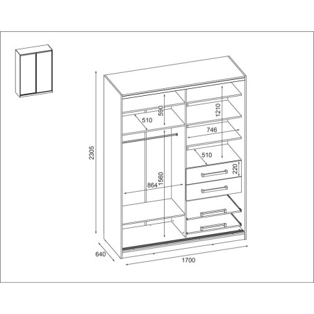 Szekrény 2D/170 - ruharúd, kihúzható polcok, ruhapolcok, fiókok