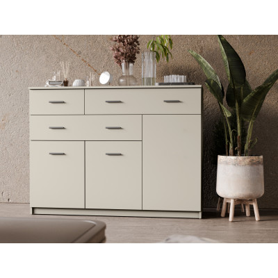 Komoda Grande o szerokości 150 cm została zaprojektowana jako pojemny mebel do salonu, który łączy zamykane szafki z rozbudowanym układem szuflad. Taka konstrukcja pozwala na wygodne przechowywanie zarówno większych elementów wyposażenia, jak i drobnych przedmiotów wymagających dobrej organizacji.