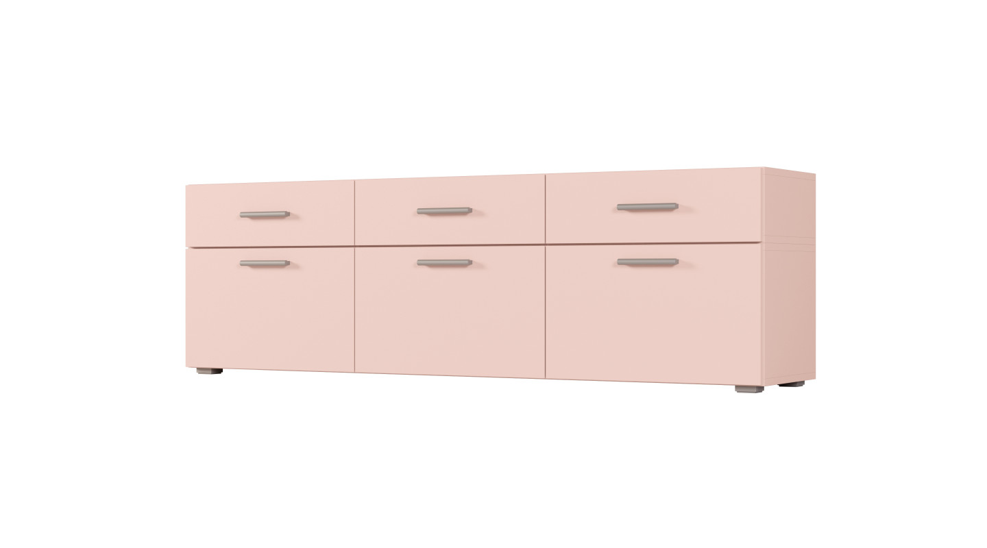Kolor Różowy nadaje komodzie nowoczesny, lekko dekoracyjny charakter i może pełnić rolę subtelnego akcentu we wnętrzu. Stonowana tonacja dobrze komponuje się z jasnymi oraz neutralnymi aranżacjami, nie dominując przestrzeni i pozwalając zachować jej uporządkowany wygląd.