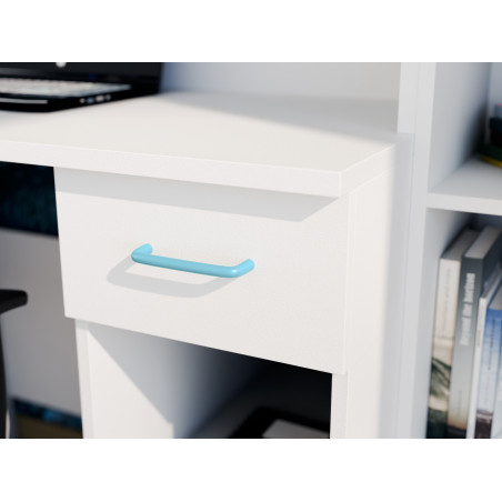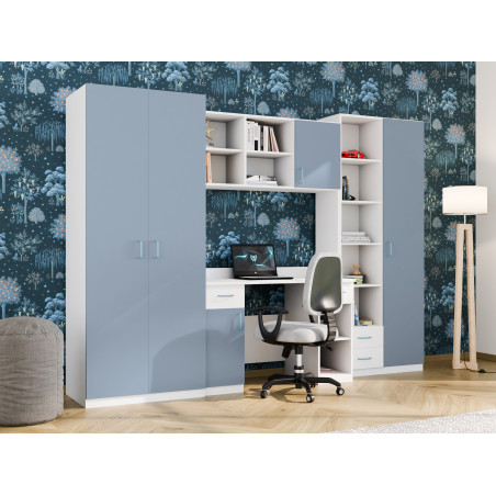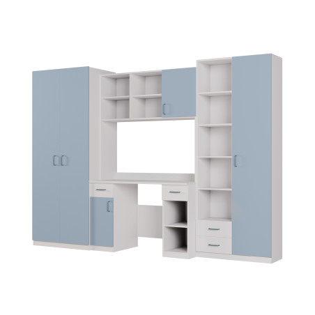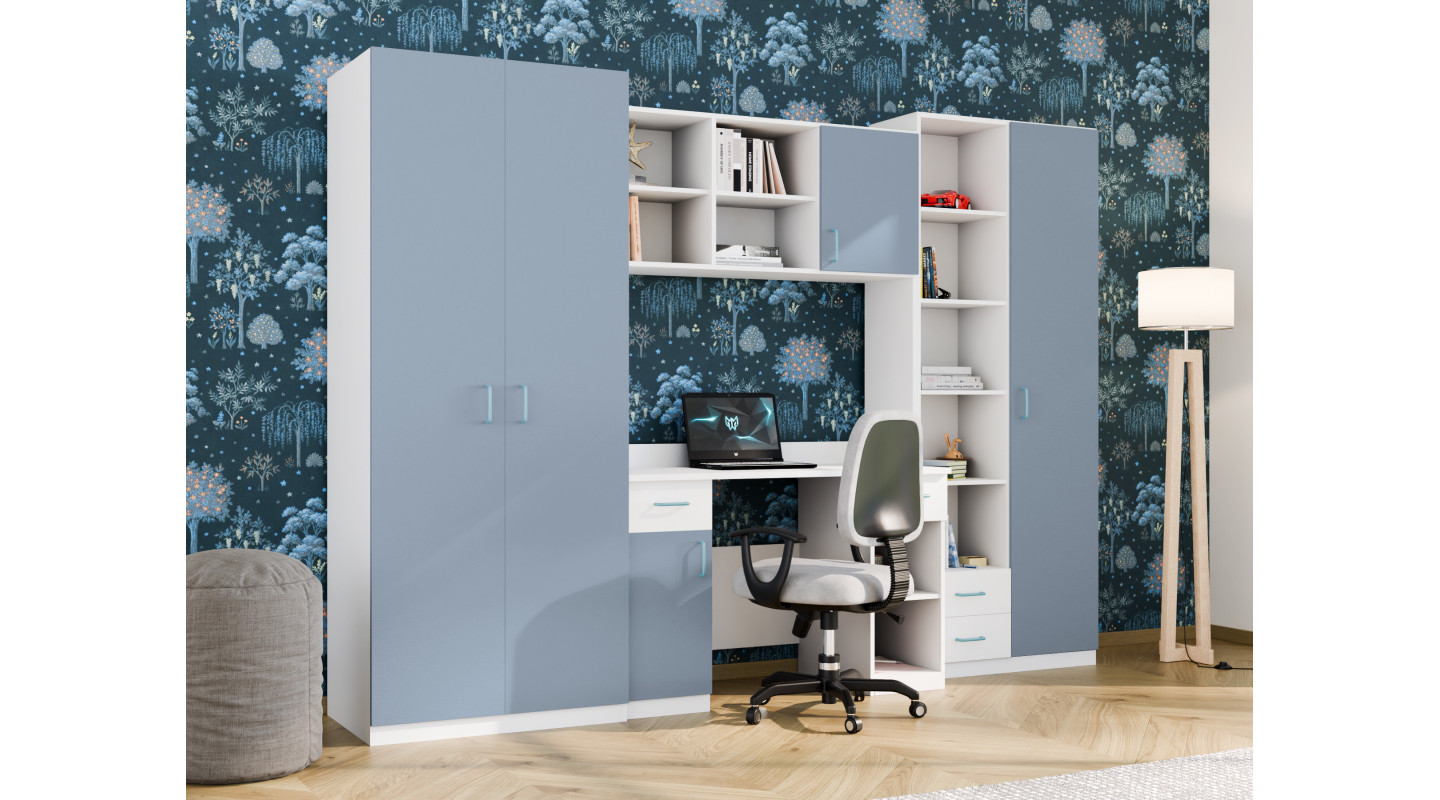 Zestaw składa się z pojemnych szaf ubraniowych, praktycznego biurka oraz licznych półek i schowków. Dzięki temu wszystko ma swoje miejsce od ubrań, przez książki i zeszyty, aż po zabawki i akcesoria szkolne. Biurko zostało zaprojektowane z myślą o wygodnej nauce i pracy przy komputerze, a półki nad nim pomagają utrzymać porządek i ułatwiają organizację codziennych obowiązków.