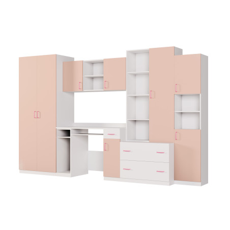 Meblościanka młodzieżowa z szafą i biurkiem 320×200 cm Biel / Różowy – NEL