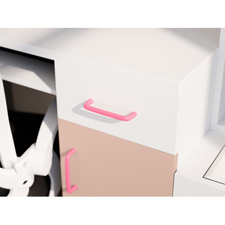Połączenie jasnej bieli z delikatnym różem nadaje meblościance lekki i przyjazny charakter, dobrze dopasowany do dziecięcych i młodzieżowych aranżacji. Taka kolorystyka sprawia, że zestaw sprawdzi się jako meblościanka młodzieżowa zarówno dla dziewczynki, jak i w pokoju młodszej nastolatki, tworząc jasną i harmonijną przestrzeń.