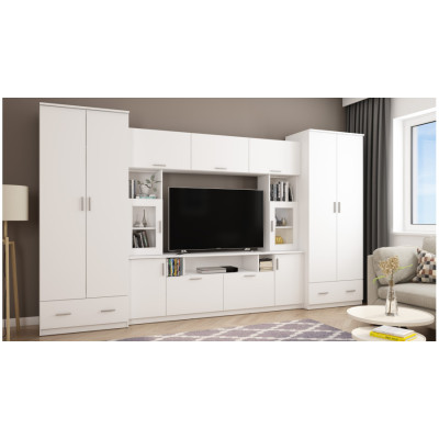 Wybarwienie Biel Arktyczna nadaje meblościance lekki, neutralny charakter. Jasna kolorystyka optycznie rozjaśnia wnętrze i sprawia, że rozbudowana bryła zestawu prezentuje się lżej, dobrze komponując się z nowoczesnymi oraz stonowanymi aranżacjami.