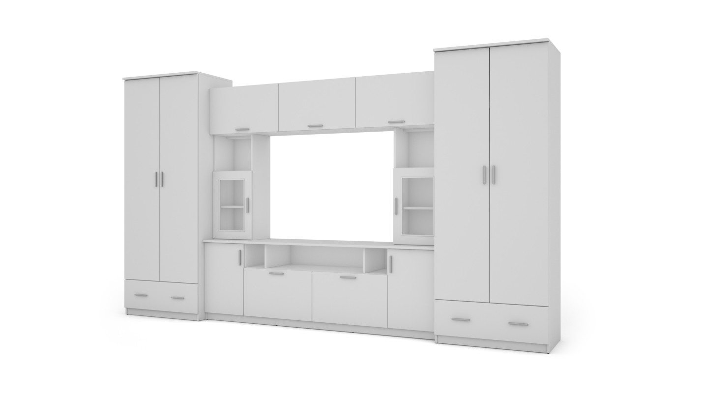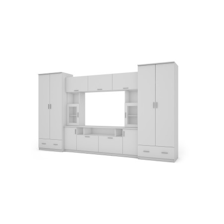 Zestaw obejmuje dwie duże szafy przeznaczone do przechowywania odzieży oraz większych elementów wyposażenia, a także zamykane szafki i półki umożliwiające uporządkowanie drobniejszych przedmiotów. Centralna część meblościanki została zaplanowana jako miejsce na telewizor z przestrzenią na sprzęt multimedialny, spójnie wkomponowaną w całość układu.