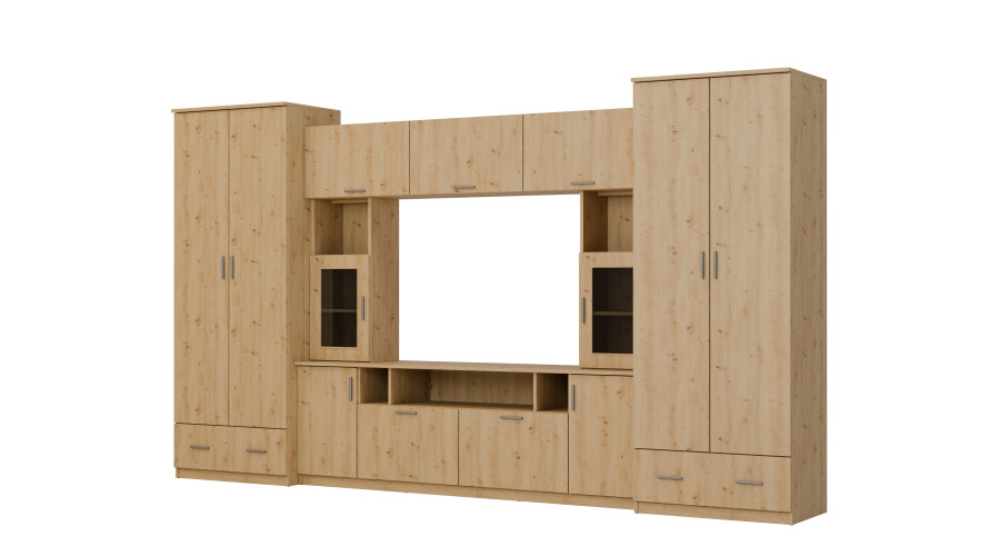 Zestaw obejmuje dwie obszerne szafy przeznaczone do przechowywania odzieży oraz większych przedmiotów, a także zamykane szafki i półki, które ułatwiają organizację drobniejszych akcesoriów. W centralnej części meblościanki przewidziano miejsce na telewizor wraz z przestrzenią na sprzęt multimedialny, harmonijnie wkomponowaną w całość układu.