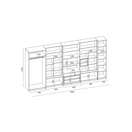 Zabudowa LENA o szerokości 405 cm i wysokości 210 cm została zaprojektowana jako rozbudowany mebel do przestrzeni dziennej, w którym przechowywanie i strefa multimedialna tworzą jedną, logicznie uporządkowaną całość. Układ łączy funkcję RTV z pojemną szafą na ubrania, szufladami oraz dodatkowymi modułami, dzięki czemu sprawdzi się we wnętrzach wymagających maksymalnego wykorzystania dostępnej przestrzeni.