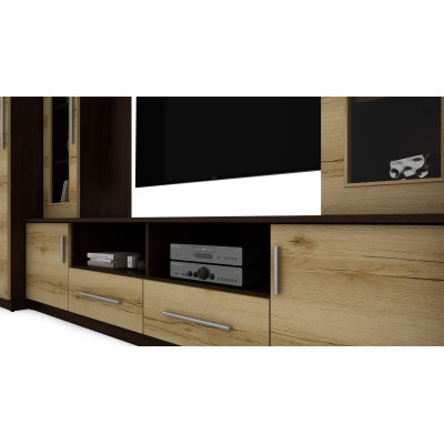 Kompaktowa meblościanka z szafami, szklanymi witrynami i strefą RTV 370×200 cm Sonoma Ciemna / Dąb Grand – NEPTUN