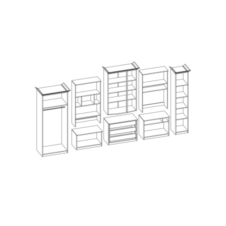 Zestaw obejmuje bardzo pojemną szafę z drążkiem na wieszaki oraz półką, a także bieliźniarkę z pięcioma półkami, co pozwala wygodnie przechowywać odzież, tekstylia oraz akcesoria. Takie rozmieszczenie modułów sprzyja utrzymaniu porządku i ogranicza potrzebę stosowania dodatkowych mebli w pomieszczeniu.