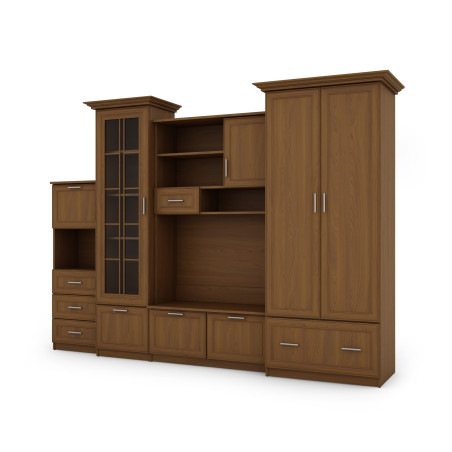 Uzupełnieniem zestawu jest słupek z barkiem oraz trzema szufladami, który podkreśla klasyczny charakter meblościanki i wprowadza dodatkową funkcję użytkową. Barek sprawdzi się zarówno do przechowywania szkła, jak i jako element porządkujący przestrzeń dzienną lub jadalnianą.