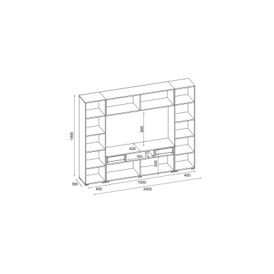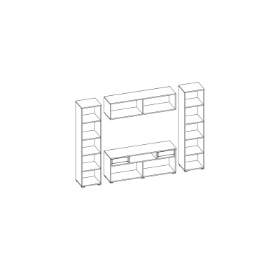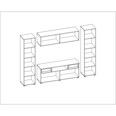 Zabudowana meblościanka PLUTON o wymiarach 240×190 cm została zaprojektowana jako spójna forma otaczająca strefę multimedialną. Układ mebla pozwala uporządkować przestrzeń wokół telewizora i jednocześnie zapewnia miejsce do przechowywania w zamkniętych modułach, bez wizualnego rozproszenia.