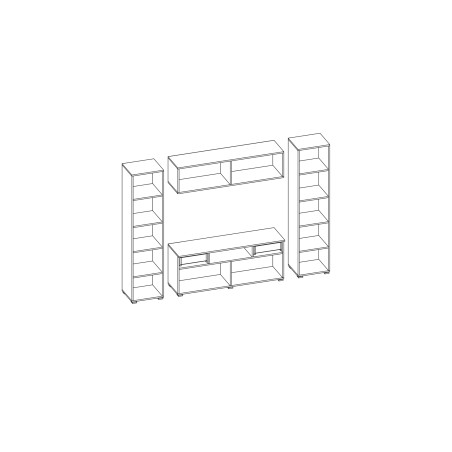 Zabudowę tworzą dwa boczne słupki z zamkniętymi półkami, które zapewniają miejsce do przechowywania różnych elementów wyposażenia domowego. Ich pionowa konstrukcja sprzyja zachowaniu porządku i umożliwia logiczny podział przechowywanych przedmiotów, przy jednoczesnym zachowaniu czytelnej formy całej meblościanki.