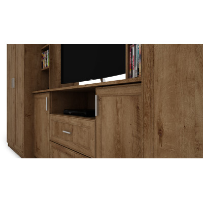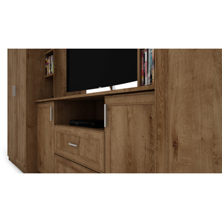 Centralną część meblościanki stanowi strefa RTV z półką na telewizor oraz sprzęt multimedialny, zaprojektowana tak, aby była wygodna w codziennym użytkowaniu. Dolne szafki i szuflady oferują praktyczne miejsce do przechowywania akcesoriów RTV, dokumentów oraz drobnych przedmiotów, pomagając utrzymać porządek w salonie.