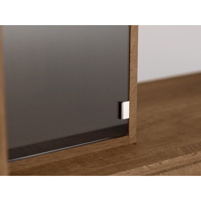 - nadstawek RTV z półkami, które mają szklane, dymione i przyciemnione drzwi.