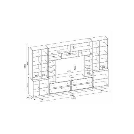 Pojemna meblościanka z otwartymi półkami, szufladami i szafkami 340×220 cm Śnieżna Biel – MODENA