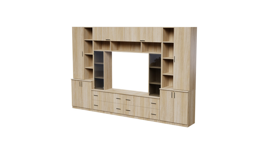 Pojemna meblościanka z otwartymi półkami, szufladami i szafkami 340×220 cm Dąb Amerykański – MODENA