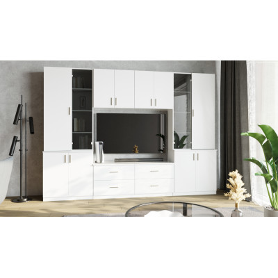 Meblościanka pokojowa z półką na TV, szafkami i szufladami 300×220 cm Śnieżna Biel – STILO