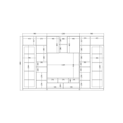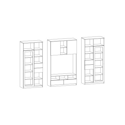 Zestaw został zaprojektowany jako funkcjonalna zabudowa salonu z wyraźnie wydzieloną strefą RTV. Centralne miejsce na telewizor uzupełniają dolne szafki, które umożliwiają wygodne przechowywanie sprzętu multimedialnego, dokumentów oraz akcesoriów, pomagając utrzymać estetyczny porządek w przestrzeni wypoczynkowej.