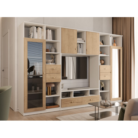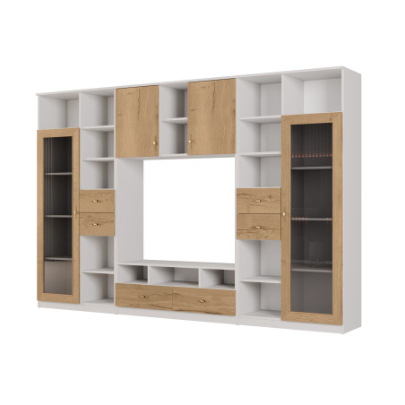 Meblościanka RTV z biblioteczką i szklaną witryną 300×200 cm Biel / Dąb Halifax Naturalny – Agata