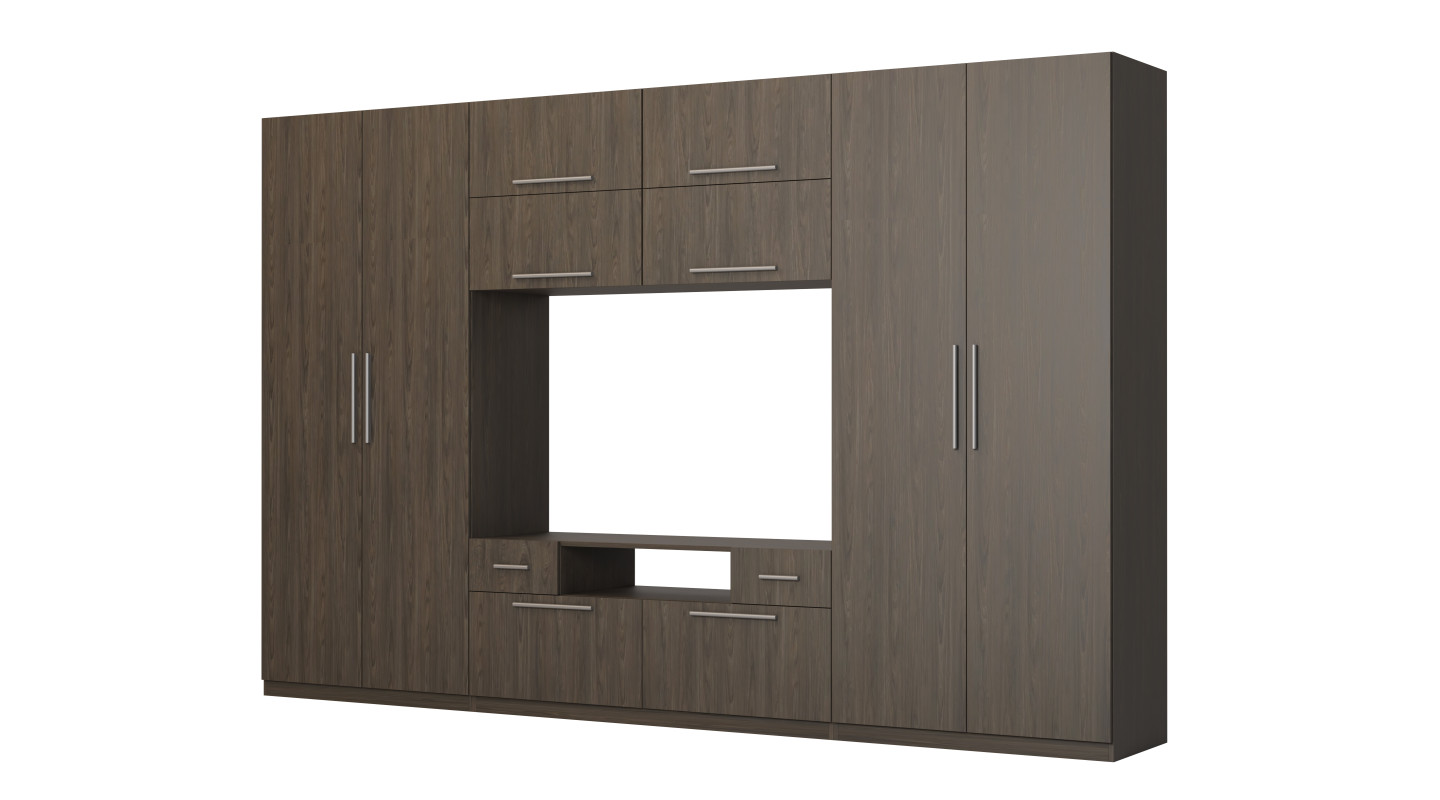 Centralna część meblościanki została zaprojektowana jako funkcjonalna strefa RTV. Miejsce na telewizor oraz sprzęt audio-wideo pozwala stworzyć estetyczny i spójny kącik multimedialny, bez nadmiaru widocznych kabli czy dodatków. Przemyślany układ otwartych i zamykanych przestrzeni sprzyja zachowaniu porządku, a górna nadstawka zwiększa pojemność zestawu i umożliwia efektywne wykorzystanie wysokości pomieszczenia, bez konieczności montażu elementów do ściany.