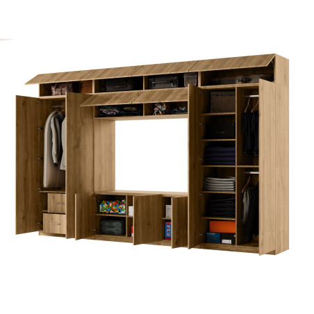 Zabudowa o szerokości 365 cm oferuje imponującą przestrzeń do przechowywania, która pozwala zachować porządek w salonie bez kompromisów. Pojemne szafy po obu stronach zabudowy kryją za zamkniętymi drzwiami ubrania, tekstylia i rzeczy sezonowe, a salon pozostaje czysty i zorganizowany. Przemyślany układ zamkniętych i otwartych przestrzeni sprawia, że meblościanka pełni jednocześnie funkcję garderoby, regału i centrum medialnego salonu.