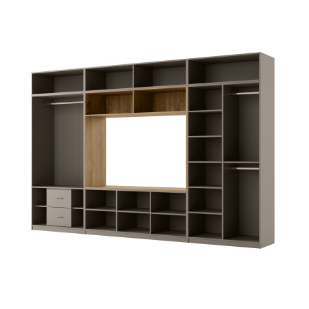 Zabudowa o szerokości 365 cm oferuje imponującą przestrzeń do przechowywania, która pozwala zachować porządek w salonie bez kompromisów. Pojemne szafy po obu stronach zabudowy kryją za zamkniętymi drzwiami ubrania, tekstylia i rzeczy sezonowe, a salon pozostaje czysty i zorganizowany. Przemyślany układ zamkniętych i otwartych przestrzeni sprawia, że meblościanka pełni jednocześnie funkcję garderoby, regału i centrum medialnego salonu.