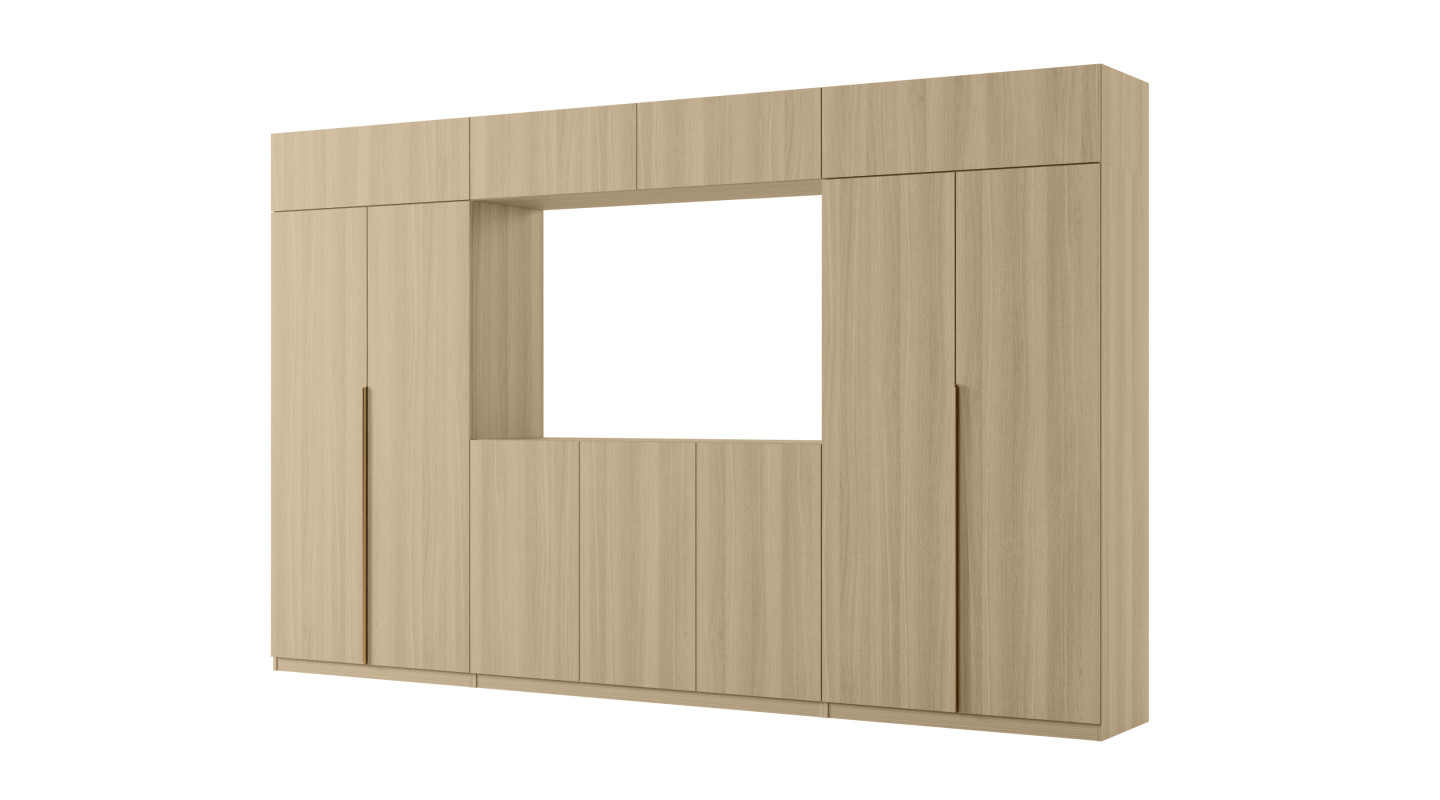 Centralną część stanowi otwarta wnęka RTV, która tworzy funkcjonalny i estetyczny kącik multimedialny. Dolne szafki pod wnęką pozwalają schować kable, dekodery i inne akcesoria, utrzymując perfekcyjny porządek w strefie telewizyjnej. Jednolita kolorystyka całej zabudowy, włącznie z nadstawką, podkreśla naturalny charakter dębu eleganckiego i pozwala w pełni wykorzystać wysokość pomieszczenia bez konieczności mocowania elementów do ściany.