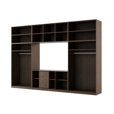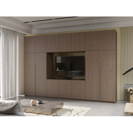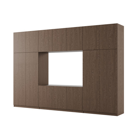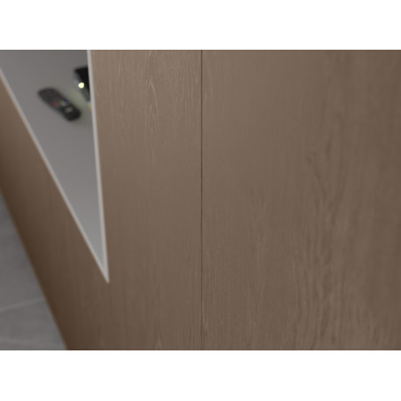 Zabudowa kryje imponującą przestrzeń do przechowywania. Pojemne szafy sięgające sufitu pozwalają przenieść cały nieporządek za zamknięte drzwi i salon pozostaje czysty i zorganizowany, a głęboka kolorystyka dębu baltic storm nadaje całości spójny i zdecydowany wyraz. Centralną część zabudowy stanowi otwarta wnęka RTV wykończona w ciepłym odcieniu drewna. To celowo wyeksponowany element, który kontrastuje z ciemnym usłojeniem frontów i wprowadza do kompozycji naturalną lekkość. Poniżej wnęki znajdują się zamknięte szafki, w których można schować kable, dekodery i inne akcesoria.