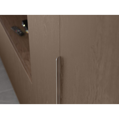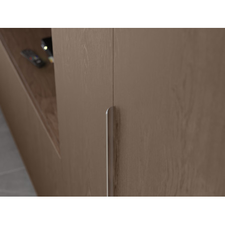 Fronty meblościanki wyposażone są w system push-to-open (tip-on). Otwieranie odbywa się przez lekkie naciśnięcie drzwi, bez konieczności stosowania uchwytów czy klamek. To rozwiązanie wzmacnia minimalistyczny charakter zabudowy i sprawia, że korzystanie z mebla jest intuicyjne na co dzień. Brak wystających elementów oznacza też mniej miejsc zbierających kurz.