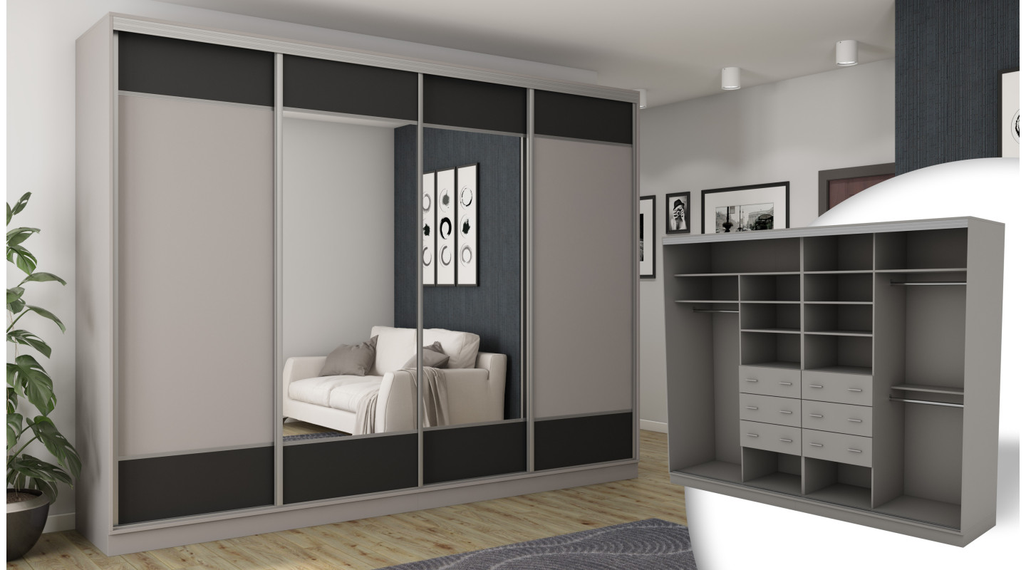 Szafa przesuwna 4D/320 to niezastąpiony mebel, który doskonale sprawdzi się jako garderoba w twoim domu. Jej przestronne wnętrze z inteligentnie zaprojektowanymi półkami zapewni porządek. Dodatkowo, lustro umieszczone na froncie zachęca do przeglądania się. Elegancki i minimalistyczny styl tej szafy przyciąga wzrok każdego domownika!