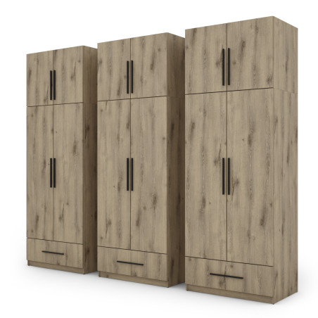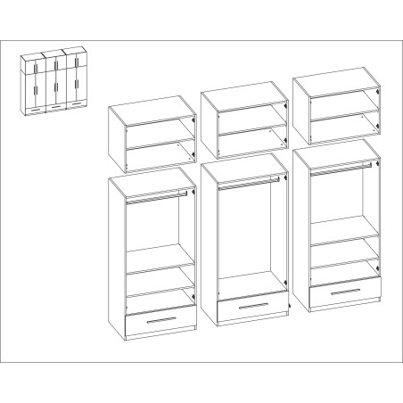 Funkcjonalność oddają półki, drążki oraz szuflady. Zestaw składa się z 6 oddzielnych segmentów (3 szafy dolne i 3 nadstawki), które wspólnie tworzą pojemną garderobę. Każdy segment cechuje inna funkcjonalność i przeznaczenie, a łącząc wszystkie otrzymasz niezwykle pakowny zestaw z miejscem na wszystkie swoje rzeczy. Jeśli chcesz, szafy można również postawić oddzielnie, co jest ich niewątpliwym atutem.
