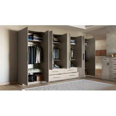 Wewnątrz szafy znajdziesz 4 drążki na wieszaki ubraniowe, z czego 2 przeznaczone są dla dłuższych elementów garderoby, takich jak płaszcze czy suknie, a pozostałe 2 dla krótszych ubrań, jak koszule czy spódnice. To doskonałe rozwiązanie, które pozwoli utrzymać ubrania w porządku i bez zagnieceń.