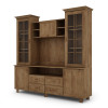 W środkowej części znajduje się wnęka z otworami umożliwiającymi uporządkowanie przewodów i zachowanie estetyki wokół sprzętu. Po bokach umieszczono przeszklone segmenty z półkami do prezentacji książek, szkła lub dekoracji, a dolne szafki pozwalają przechowywać sprzęt i akcesoria poza widokiem. Taki podział zwiększa czytelność strefy RTV i ułatwia organizację.