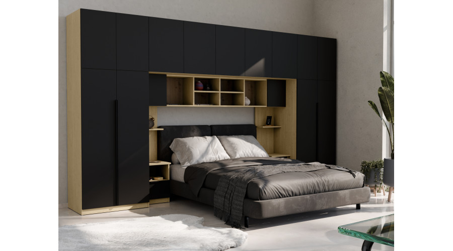 Zabudowa do sypialni Jula to propozycja dla osób, które cenią nowoczesny styl, funkcjonalność i wysoką jakość wykonania. Starannie zaprojektowana konstrukcja łączy w sobie elegancki design z praktycznymi rozwiązaniami, które ułatwiają codzienne korzystanie z mebli i sprawiają, że sypialnia staje się miejscem komfortowym i uporządkowanym. Połączenie czarnych, matowych frontów z naturalnym drewnem nadaje całości wyjątkowego charakteru dzięki czemu wnętrze zyskuje nowoczesny, ale jednocześnie przytulny klimat.