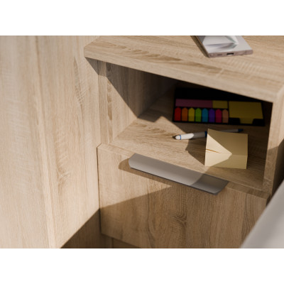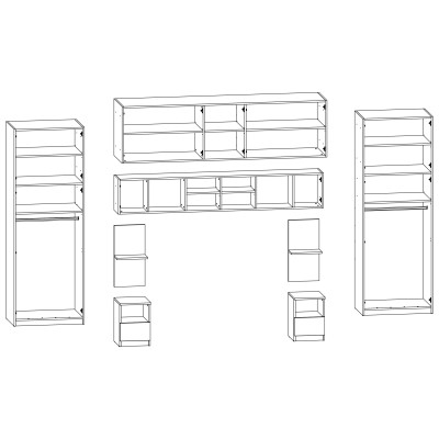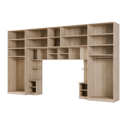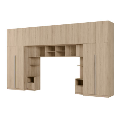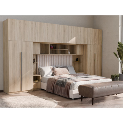 Centralnym punktem zestawu Jula jest przestrzeń na łóżko, otoczona praktycznymi szafami, szafkami nocnymi i półkami. Zamknięte moduły pozwalają wygodnie przechowywać ubrania i akcesoria, a otwarte wnęki mogą pełnić rolę miejsca na dekoracje, książki lub drobne przedmioty codziennego użytku. Taka organizacja przestrzeni sprawia, że sypialnia zyskuje nie tylko nowoczesny wygląd, ale również pełną funkcjonalność.